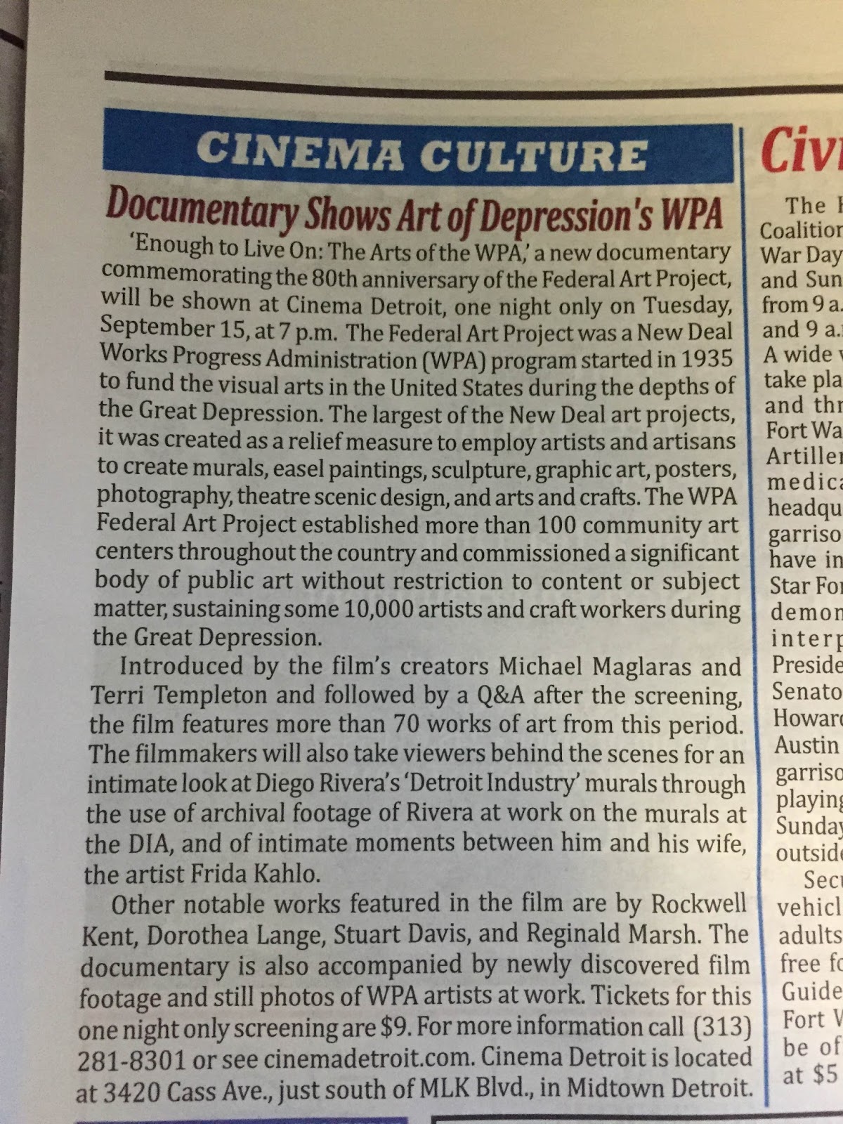 Our new film “Enough to Live On: The Arts of the WPA” will screen at Cinema Detroit. Don’t miss your chance to see it!