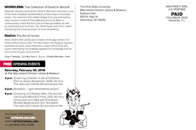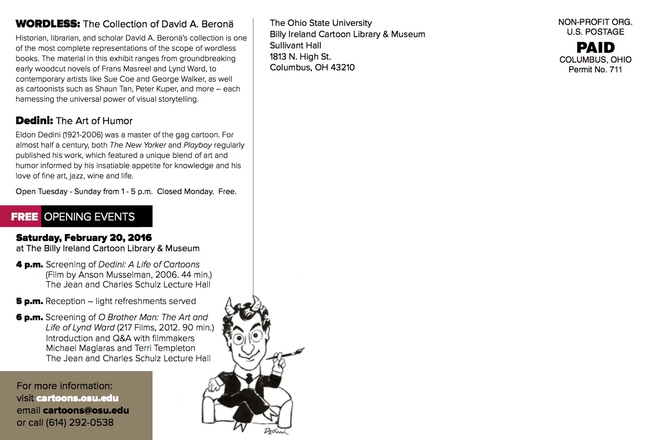 Lynd Ward is the father of the American graphic novel and one of the most prolific book illustrators and printmakers in the history of American art. The Columbus premiere of 217 Films’ documentary “O Brother Man: The Life and Art of Lynd Ward” will be held Saturday, February 20 at 6:00pm at the Billy Ireland Cartoon Library and Museum in conjunction with the exhibition WORDLESS: The Collection of David Berona and Dedini: The Art of Humor. Full details about this exhibit can be viewed at this link.