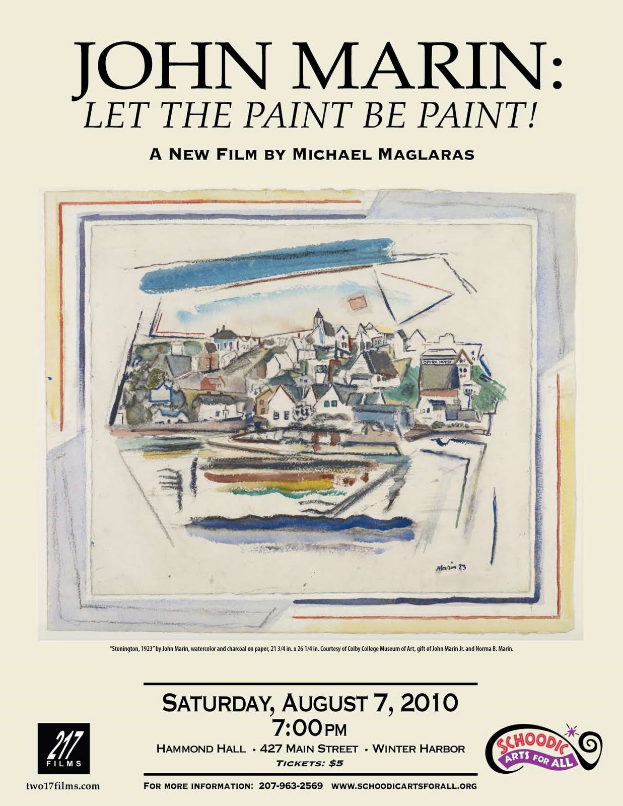 Filmmakers Michael Maglaras and Terri Templeton of 217 Films will screen their new Maine-made film “John Marin: Let the Paint be Paint!” at the Schoodic Arts Festival in Winter Harbor, Maine on Saturday, August 7 at 7:00pm.